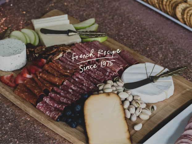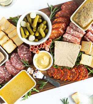 We <3 liver. Whether coarsely chopped or emulsified into a spreadable paste, pâtés are the real soul of French charcuterie and what won us acclaim back in 1975. To make our pâté, a mixture of liver and meat is mixed with a glug of fine French spirits or wine, aromatic spices, and cooked in a mold on low heat before being sealed up in convenient 8oz or 5oz packages.